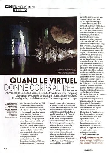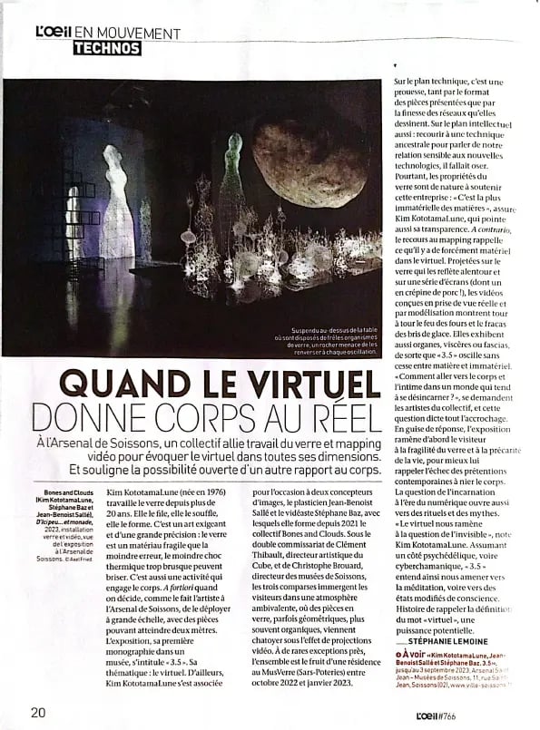 L'exposition " À quoi rêvent les ondes ? " du collectif Bones and Clouds à la galerie Da-End à Paris est bouleversante à plus d'un titre. En premier lieu, une pierre monumentale menace inexorablement un paysage de figures organiques en verre dont la fragilité apparente et la délicatesse indéniable nous émeuvent immédiatement. Tout autour, de sculptures (Kim KototamaLune) en vidéos (Jean-Benoist Sallé & Stéphane Baz), les oeuvres envahissent l'espace de la galerie, tels des rhizomes, en se superposant et en se clonant, voire même en se fusionnant. D'un coté, les vidéos éclairent donc les sculptures ou les prolongent; de l'autre, les sculptures servent d'écrin ou de sujets aux images. Mais ce que l'on voit n'est pas ce qu'il faut voir. L'essentiel est moins dans cette poésie du visible et de l'invisible, du matériel et de l'immatériel, de la gravité et de la légèreté que les artistes ont su si magistralement mettre en oeuvre que dans ce que cette poésie nous signale sans l'exprimer explicitement - les ondes ? - : le futur du monde n'est pas dans ce que nous imaginons ou décidons, mais dans ce que la nature et ses écosystèmes réalisent depuis l'infini des temps hors, à côté et, surtout, malgré nous.
